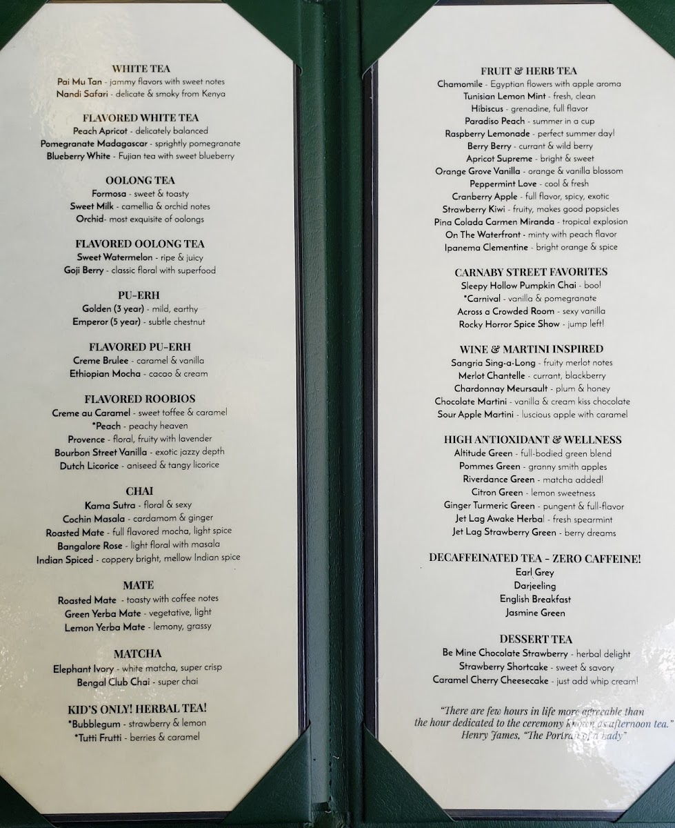 Tea enthusiasts will love the separate tea menu, featuring classic English favorites alongside unique blends. The experience is further enhanced by a tempting array of pastries, including the crowd-favorite flourless chocolate cake.